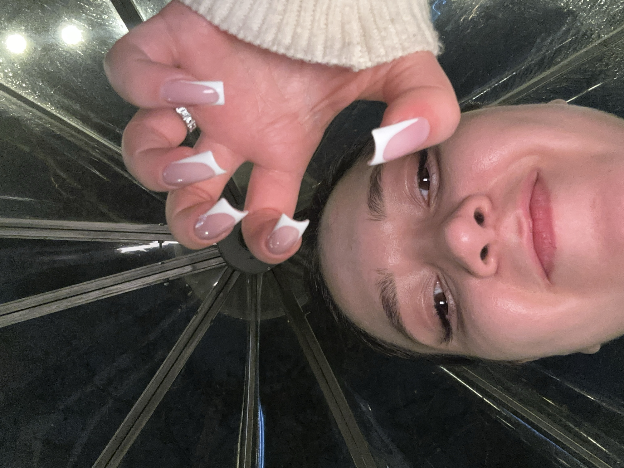 A person is facing downward, their face close to the camera. They have light skin, brown eyes, and pink lips. Their hand, with long nails painted in a white-tipped French manicure style, is positioned above their face. A ring is visible on one of their fingers. The background features a black, reflective surface with radial lines emanating from the center, resembling an umbrella or a starburst pattern. There are no indications to determine that the location is Yerevan, Armenia.