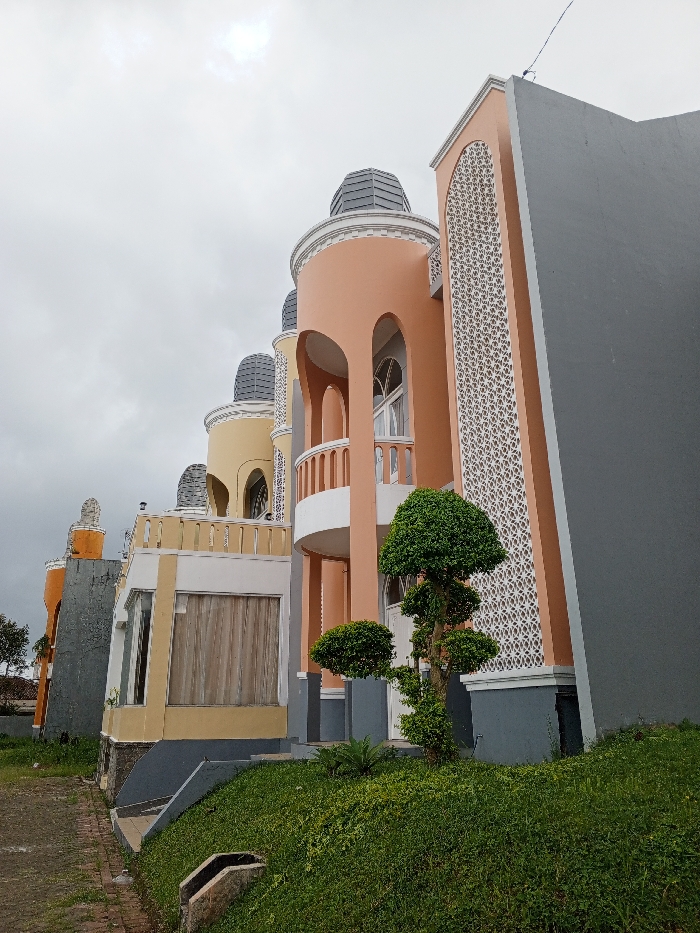 The image displays a row of multi-story buildings, likely part of a residential complex or resort, under an overcast sky in the city of Unknown, Unknown