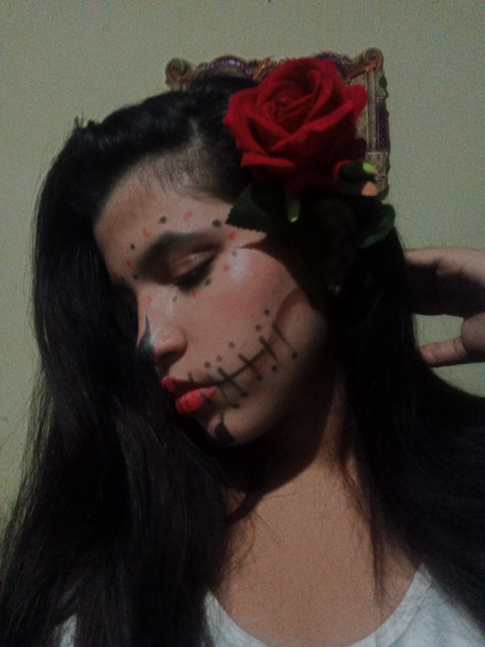 The location is specified as Juan Griego, Venezuela. The image features a close-up portrait of a female subject, positioned with her head slightly tilted downwards and to her right, with eyes cast downwards or closed. She has long, dark, straight hair, which partially obscures the left side of her face and extends over her shoulder. Her face is adorned with theatrical makeup: small black and red dots are applied to her forehead and upper cheeks; the tip of her nose is painted black; her lips are painted red, and black lines extend laterally from the mouth corners, intersected by several vertical black marks, creating a stitched effect. A black smudge is present below the left corner of the mouth. An artificial red rose with green foliage is positioned in the subject's hair above her right ear. A left hand is partially visible behind the subject's head, with fingers touching the hair. She wears a light-colored, round-neck top. The background consists of a light-toned, unadorned wall. An ornate, possibly gilded, frame is partially visible in the upper right background. Illumination creates a shadow on the subject's right cheek and jawline.