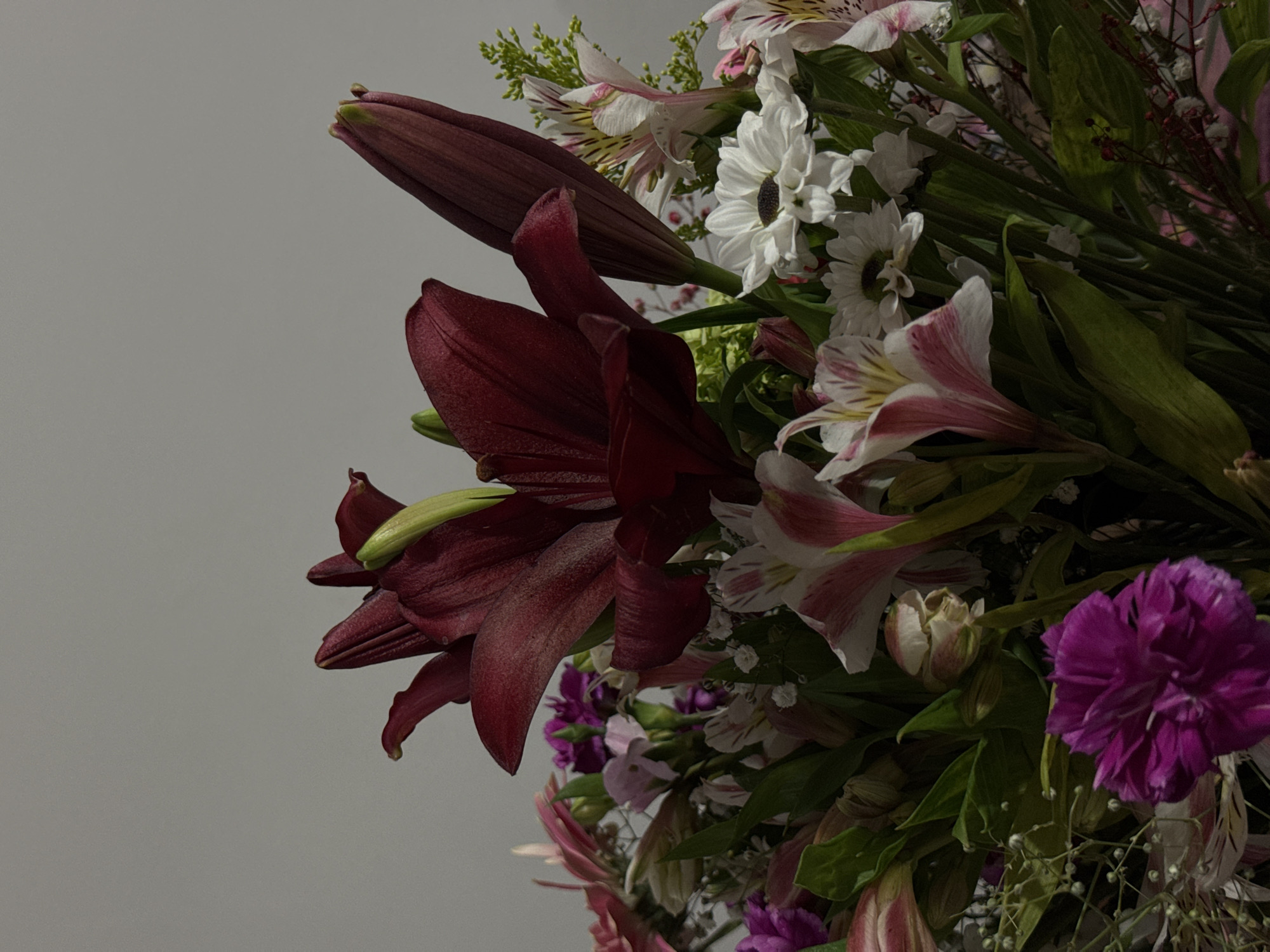 The image features a bouquet of mixed flowers against a gray background. Dominating the left side is a dark red lily with some buds. To the right of the lily are white chrysanthemums, pink and white alstroemeria, and a purple carnation. Green foliage is interspersed throughout the arrangement. The photograph appears to be taken indoors. There is no indication of Paraje el Ciruelar, Mexico in the image.