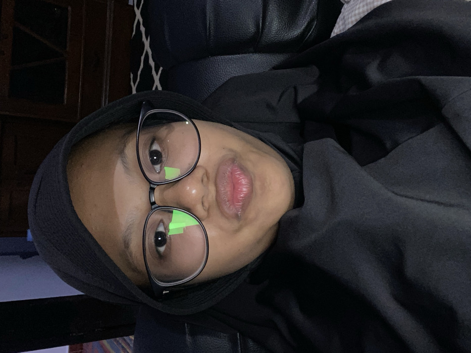 An indoor, close-up image depicts a person in Kebonsari, Indonesia. The individual, appearing to be female, has medium-toned skin, wears black-rimmed eyeglasses, a black hijab, and a black garment. Green, rectangular light reflections are visible on both lenses of the eyeglasses. The subject's lips are pursed, and they look directly towards the camera. The immediate background to the right includes a dark, possibly leather, sofa with visible seams. Behind the sofa, a patterned black and white rug and a dark wooden furniture piece or door are visible. A light-colored wall and a colorful striped textile are present on the left side of the frame. The scene is illuminated by artificial light sources.