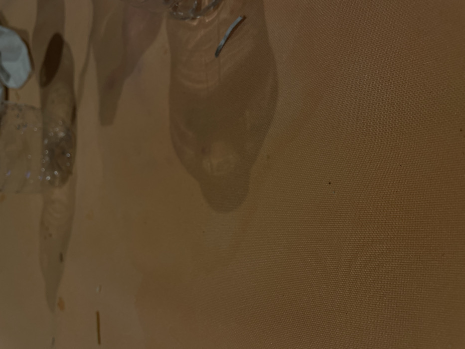 close-up of a tan textured surface with blurred reflections. A glass object is reflected, showing a cylindrical shape with a lip. Small white fragments and reflective silver particles are also reflected, suggesting scattered debris. The light creates strong shadows, obscuring details. A thin, dark line and small spots are visible on the surface, possibly imperfections.