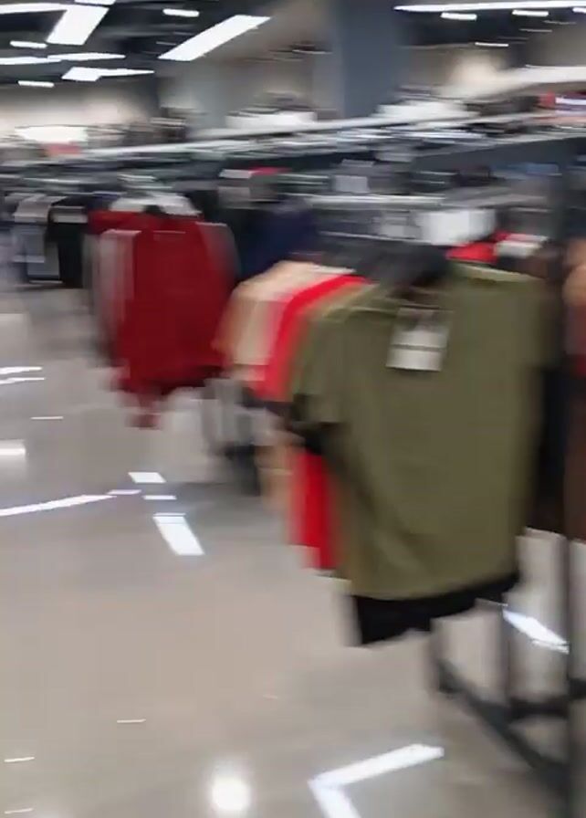 interior of a clothing store. The floor is shiny and reflective, and the lighting is bright. Clothes are hanging on racks. The color scheme is mostly red, white, and black. There are no people visible in the video.