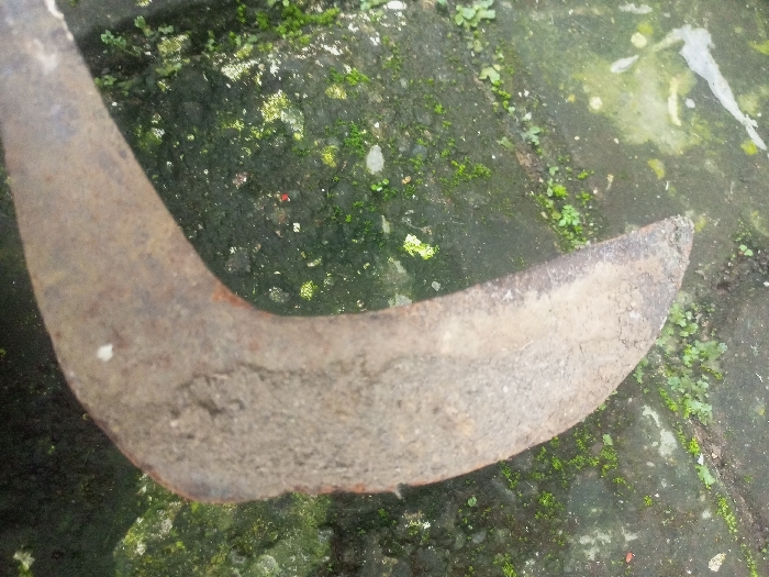 **Location:** Zee Pin Kone, Myanmar. **Scene Description:** The image presents a close-up, top-down perspective of a heavily rusted, curved metal blade, likely a component of a larger tool such as a sickle or an agricultural implement. The blade exhibits significant surface corrosion, characterized by a textured, earthy-brown and reddish-brown rust layer, with some adhering soil or debris. The leading edge of the blade appears dulled and uneven, showing signs of wear and minor chipping. The object rests upon a dark, uneven ground surface, possibly concrete or paving stones, which is extensively covered by patches of vibrant green moss and scattered small green plants or weeds. Occasional lighter-colored fragments or faded markings are visible on the ground surface between the vegetation. No human subjects, actions, or interactions are present within the frame.