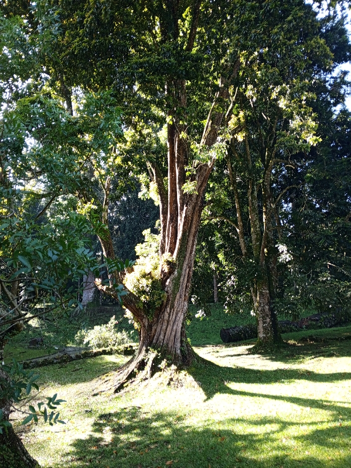 A majestic, large tree dominates the center of the image, its thick trunk splitting into several branches reaching towards the sky