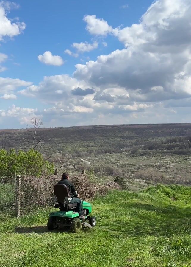 - "A man is operating a green lawnmower on a grassy hill overlooking a vast valley landscape" by FM-2RVs73, licensed under CC BY 4.0