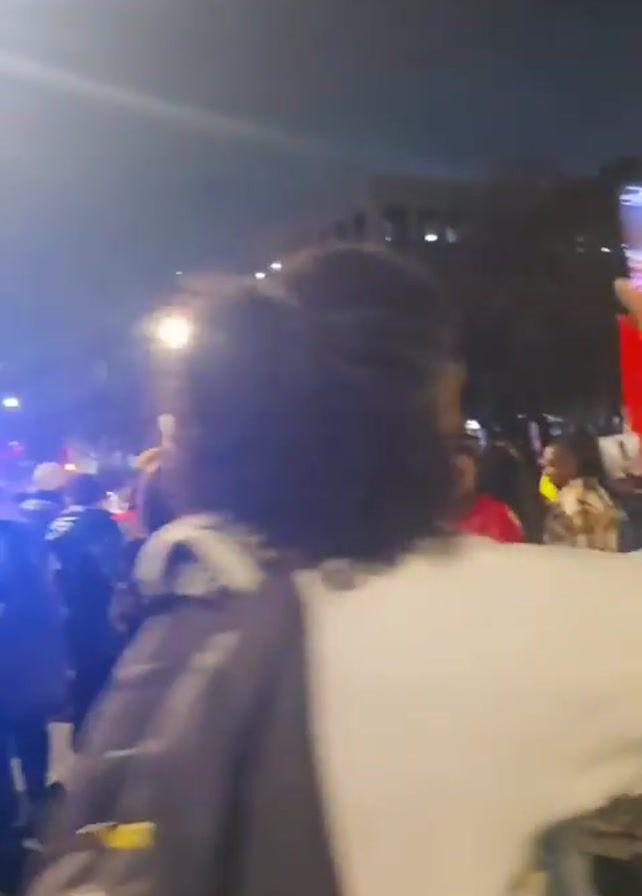 A crowd of people gathered at night, some holding signs that read "Stop Cop Nation We Keep Us Safe." People are wearing various outfits and are moving around. Some people are holding up their phones to record or take photos. The surroundings include buildings and streetlights.