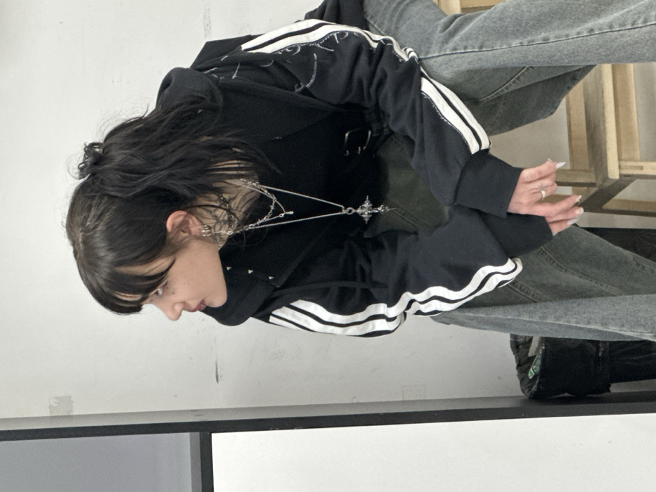 The image displays a young female subject seated indoors in Rostov-on-Don, Russia. The subject is positioned in profile, facing to the left of the frame. She has dark hair, styled with bangs and the remainder pulled back into a high, messy ponytail. Her left ear exhibits multiple piercings. She wears a black zip-up hoodie featuring two parallel white stripes on each sleeve and lighter-toned decorative patterns on the viewer's right sleeve. Beneath the hoodie, a dark inner garment is visible. Multiple silver-toned necklaces adorn her neck, including a layered chain with a small teardrop pendant and a longer chain suspending a large, intricate cross pendant. A dark band, possibly a choker or tattoo, is visible on her neck. Her hands are clasped together in front, displaying light-colored fingernail polish and a simple ring on the left ring finger. She is dressed in loose-fitting grey jeans and is seated on a light-colored wooden stool, parts of which are visible in the lower right. The background consists of a plain, light-colored wall. A vertical dark panel or frame edge, with an adjacent white strip, is present on the far left. A black plastic trash can with a liner is partially visible in the lower-left corner. The subject's gaze is directed towards the left.