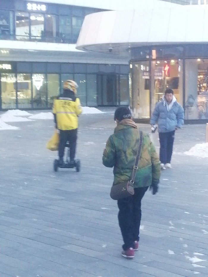 An outdoor pedestrian plaza in Fengtai District, China, is depicted under diffused daylight, with scattered snow patches on a light-colored planked surface. Three individuals are present. In the foreground, a person walks away from the camera, wearing a dark cap, a camouflage-patterned padded jacket, dark trousers, red sneakers, and a brown cross-body bag. In the middle ground, an individual, likely a delivery worker, operates a black self-balancing scooter. They wear a yellow helmet, a bright yellow jacket, dark trousers, and carry a yellow bag. In the background, a male individual walks, dressed in a light blue puffer jacket over a white hoodie, dark blue trousers, and white sneakers. Modern commercial buildings with extensive glass facades and some illuminated storefronts are visible behind the individuals, with snow accumulated at their foundations.
