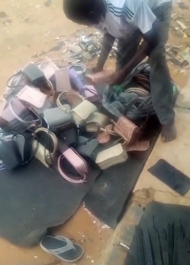 A person wearing a white shirt and dark pants stands barefoot on a dirt surface, sorting through a pile of handbags