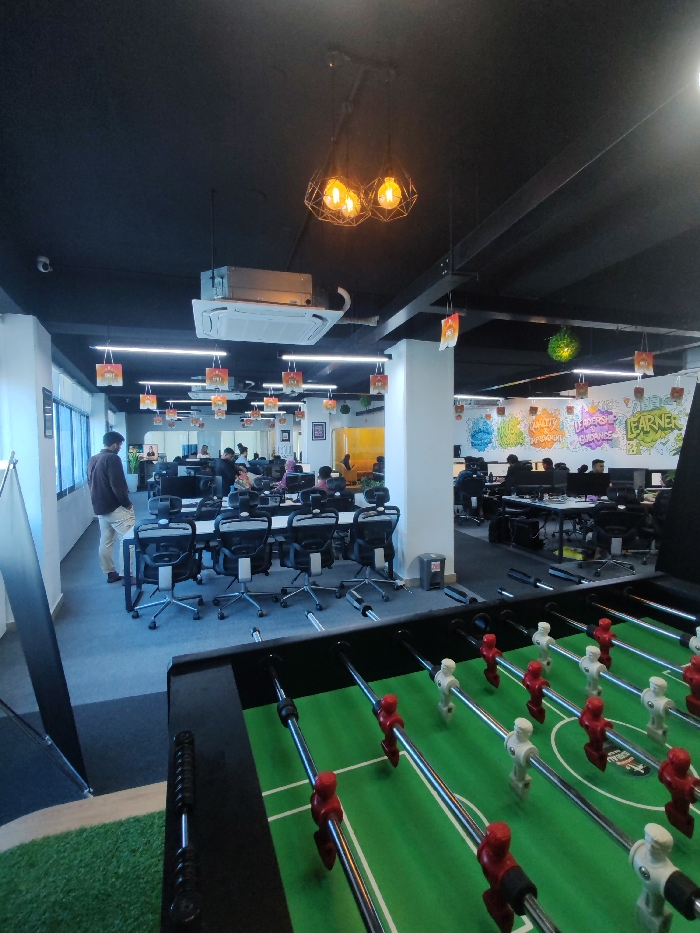 An open office space with rows of desks and chairs, occupied by individuals working on computers. A foosball table dominates the foreground, with green playing surface and red and white players. Hanging light fixtures illuminate the dark ceiling above. A wall with colorful graffiti-style writing adds character. A man in a casual outfit is visible in the left side of the frame, walking around the office.