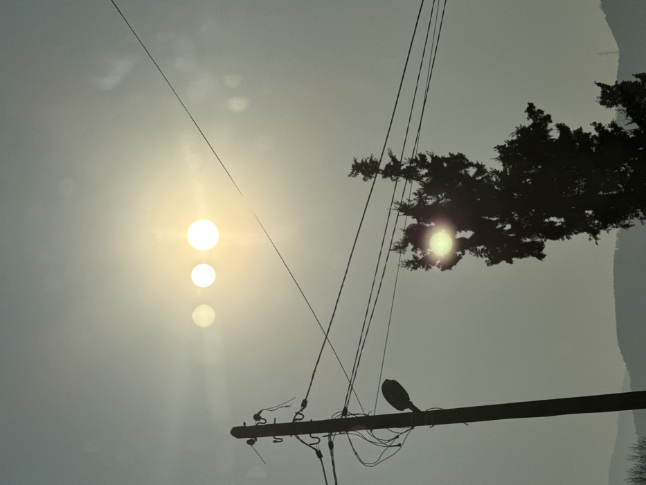 The image depicts an outdoor daytime scene under a hazy or overcast sky, viewed from a low angle. The sky, appearing light gray-blue, prominently displays three distinct, bright circular light sources, likely lens flares, arranged horizontally from left to right in the upper half of the frame. The leftmost light source is the dimmest, and the rightmost is the brightest, resembling multiple suns. In the left foreground, a dark, vertical utility pole with a street light fixture attached is visible. Multiple dark utility wires extend from the pole, crossing the sky horizontally and diagonally. To the right of the pole, a tall, dark silhouette of a coniferous tree occupies the midground, with its upper branches reaching towards the center of the frame. One of the circular light sources appears partially obscured by the tree's foliage. The distant background, visible in the lower-left, consists of hazy, undulating hills or mountains. No people, discernible actions, or interactions are present. The scene is backlit, rendering the foreground objects as dark silhouettes against the brighter sky. The location is Unknown, Unknown.