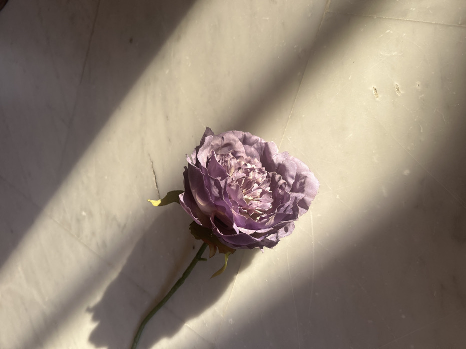 - "The scene depicts a single, artificial flower, predominantly lavender-purple in hue with layered petals, resting on a light-colored marble surface" by FM-zuUTB3, licensed under CC BY 4.0