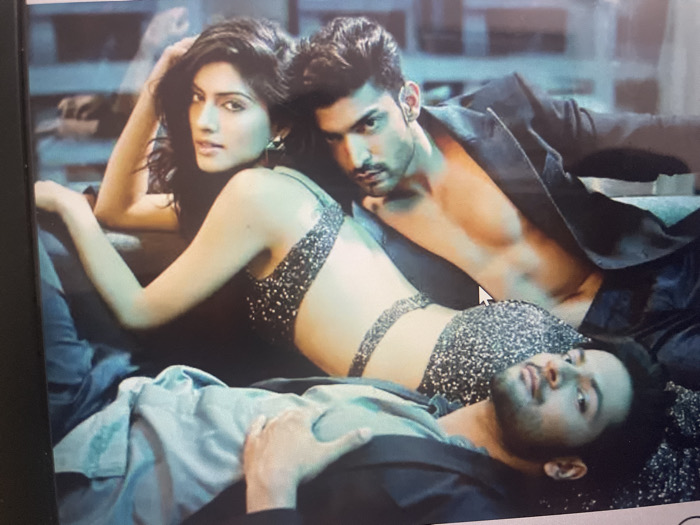 The image depicts a staged indoor scene featuring three individuals: two males and one female. The precise location within Abuja, Nigeria, is not discernable from the visual information provided; the environment appears to be a studio or a styled interior space. The female subject, positioned on the left, is lying on her left side, partially propped up. She has dark hair and is wearing a dark, sparkling halter-neck bra and what appears to be dark trousers or jeans. Her right arm is raised, with her hand near her head, and she looks directly at the camera. Behind and slightly above the female, a male subject with dark hair is lying on his right side, facing the camera. He is shirtless, wearing an open dark blazer, which reveals a muscular upper torso. His left arm is bent, and he maintains direct eye contact with the camera. In the foreground, partially overlapping the lower body of the female, a second male subject with dark hair is lying on his back. He is dressed in a light blue button-down shirt, partially unbuttoned, beneath a dark blazer. His head rests on a dark surface, and he too looks directly towards the camera. All three subjects are posed, suggesting a professional photoshoot. The lighting is soft and focused on the individuals, while the background is dark and indistinct, indicating an intentional shallow depth of field to emphasize the subjects. No direct interaction between the subjects is evident; each maintains individual focus on the camera.