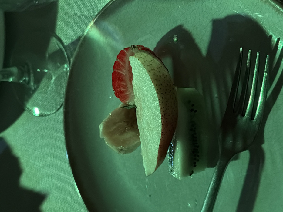 A top-down view showcases a white plate with a medley of sliced fruits and a fork. A wedge of pear with a strawberry slice atop it is prominently displayed, along with a banana slice and a segment of kiwi. A silver fork rests on the right side of the plate. A wine glass stem sits in the background. The image has a green cast. Shadows are cast by the fork and the fruits.