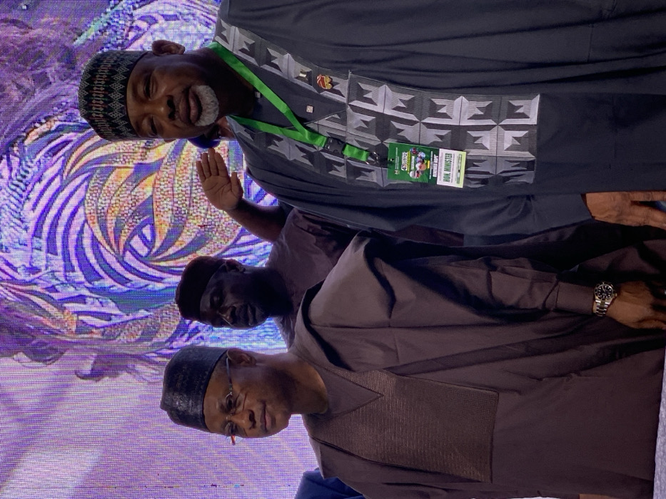 The scene depicts three adult males positioned indoors in Unguwar Sarki, Nigeria, against a large, brightly lit digital display featuring a vibrant, swirling abstract pattern primarily in purples, blues, and oranges. In the left foreground, an adult male with light brown skin, wearing dark-framed eyeglasses and a dark brown woven cap, stands with his gaze directed slightly to his left. He wears a dark brown traditional Nigerian agbada featuring a subtly patterned chest panel. A silver-toned wristwatch with a dark face is visible on his left wrist. To his right, in the foreground, an adult male with light brown skin, a grey beard, and a dark grey native cap adorned with intricate geometric patterns, stands partially facing the viewer. He wears a dark grey traditional Nigerian agbada featuring a prominent light grey geometric pattern on the chest. A green lanyard with an identification badge hangs around his neck, displaying "HON. MINISTER" and other obscured text and logos. A small red and gold pin is affixed to his agbada. Partially visible between and slightly behind the two foreground individuals is an adult male with dark brown skin. He wears a plain dark brown native cap and a dark brown garment. His right hand is raised to approximately head height, positioned near the right foreground male's shoulder, in a gesture resembling a partial salute. He is looking towards the left. The setting appears to be an event or conference, characterized by the formal attire and the large display screen.