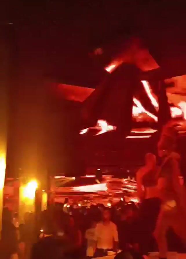 A dancer performs on a stage in a nightclub setting. The dancer, clad in a vaguely ancient-themed, revealing costume, is illuminated by red lighting and a spotlight. The crowd below is indistinct but appears large. The stage is elevated and has a complex structure above it with geometric shapes. The ceiling is dark and seemingly studded with small lights. The dancer moves rhythmically to music, engaging with the audience.