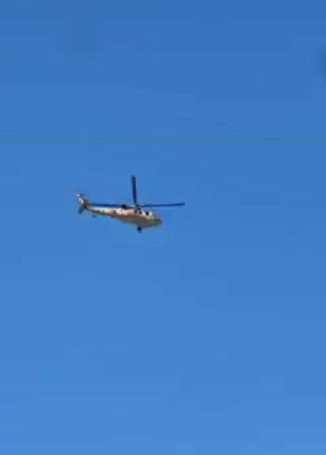 The video begins with a clear blue sky, in which a military helicopter is flying