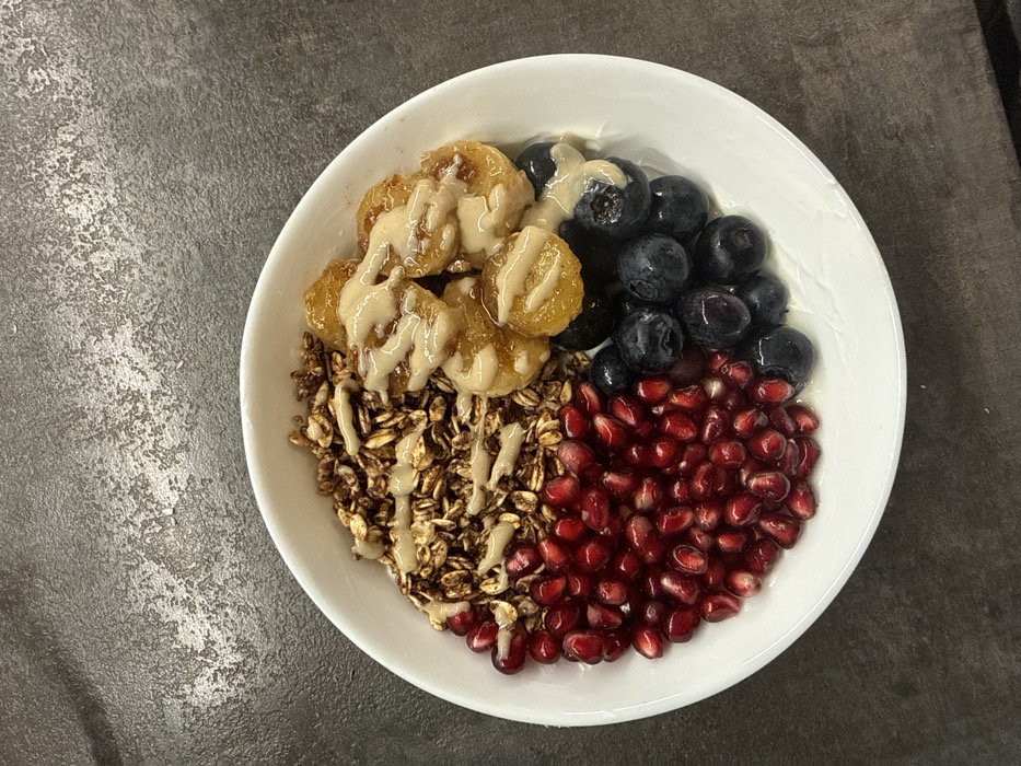 A white, circular bowl containing a multi-component meal is centrally positioned on a dark grey, mottled surface. Within the bowl, the meal is sectioned into four distinct areas: the upper-left quadrant contains brown granola or oats, topped with a light beige drizzle; the upper-right quadrant features several slices of cooked, yellow-orange banana, similarly drizzled; the lower-left quadrant is filled with bright red pomegranate seeds; and the lower-right quadrant holds dark blue blueberries, some also bearing traces of the light beige substance. The background surface exhibits an irregular, distressed texture with varying shades of grey. No visual cues within the image indicate a specific location in Ruse, Bulgaria.