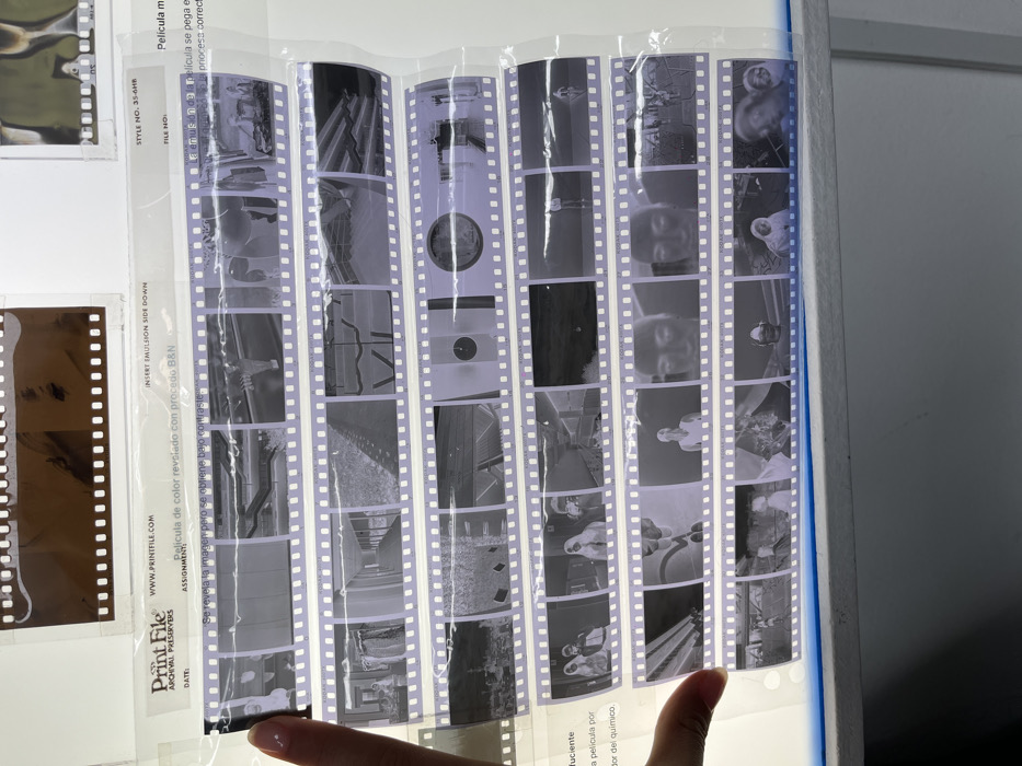 In Mexico City, Mexico, an overhead view captures multiple strips of photographic film negatives illuminated on a light table