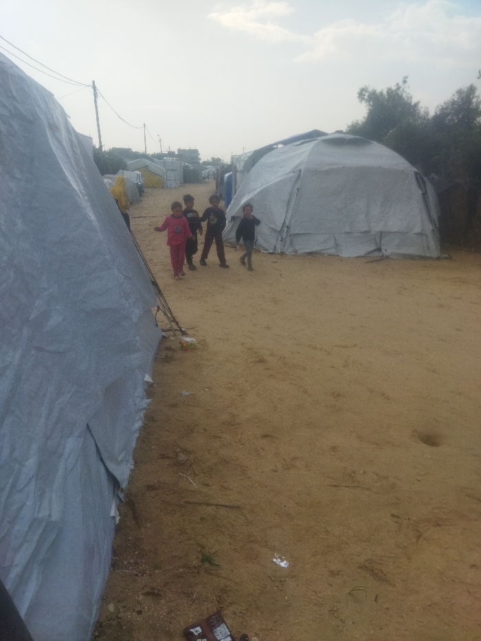 This image depicts an outdoor scene within a displacement camp in Khan Yunis, Palestinian Territory