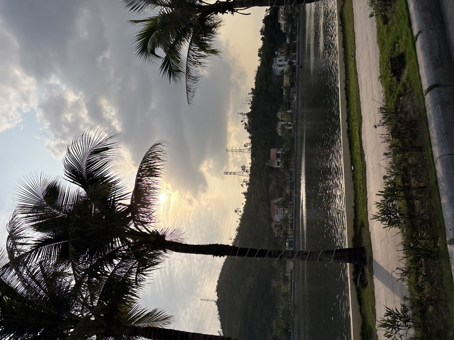 This image depicts a landscape scene in Bai Chay Ward, Vietnam, characterized by a low sun obscured by clouds, casting a warm glow. In the immediate foreground, a concrete pathway or sidewalk runs horizontally, bordered by a strip of manicured grass and low green shrubs. A grey concrete curb is visible at the bottom of the frame. Two prominent palm trees, silhouetted against the bright sky, frame the scene. The central palm tree features a light-colored material, possibly a string of lights or decorative wrap, spiraling up its trunk. A third palm tree is partially visible on the far left. Beyond the pathway lies a dark, calm body of water, likely a lake or large pond, reflecting the bright sunlight and sky. Across the water, a series of detached residential houses with varied architectural styles and roof colors (including red and grey tiles) are visible, situated at the base of a lush, forested hill. The hill rises significantly behind the houses, covered in dense green vegetation. Several large electricity transmission towers (power pylons) are visible on the slopes and crest of the hill. The sky is partly cloudy, with the sun appearing as a bright, diffuse light source through a break in the clouds, creating a backlit effect. No people or animals are present.