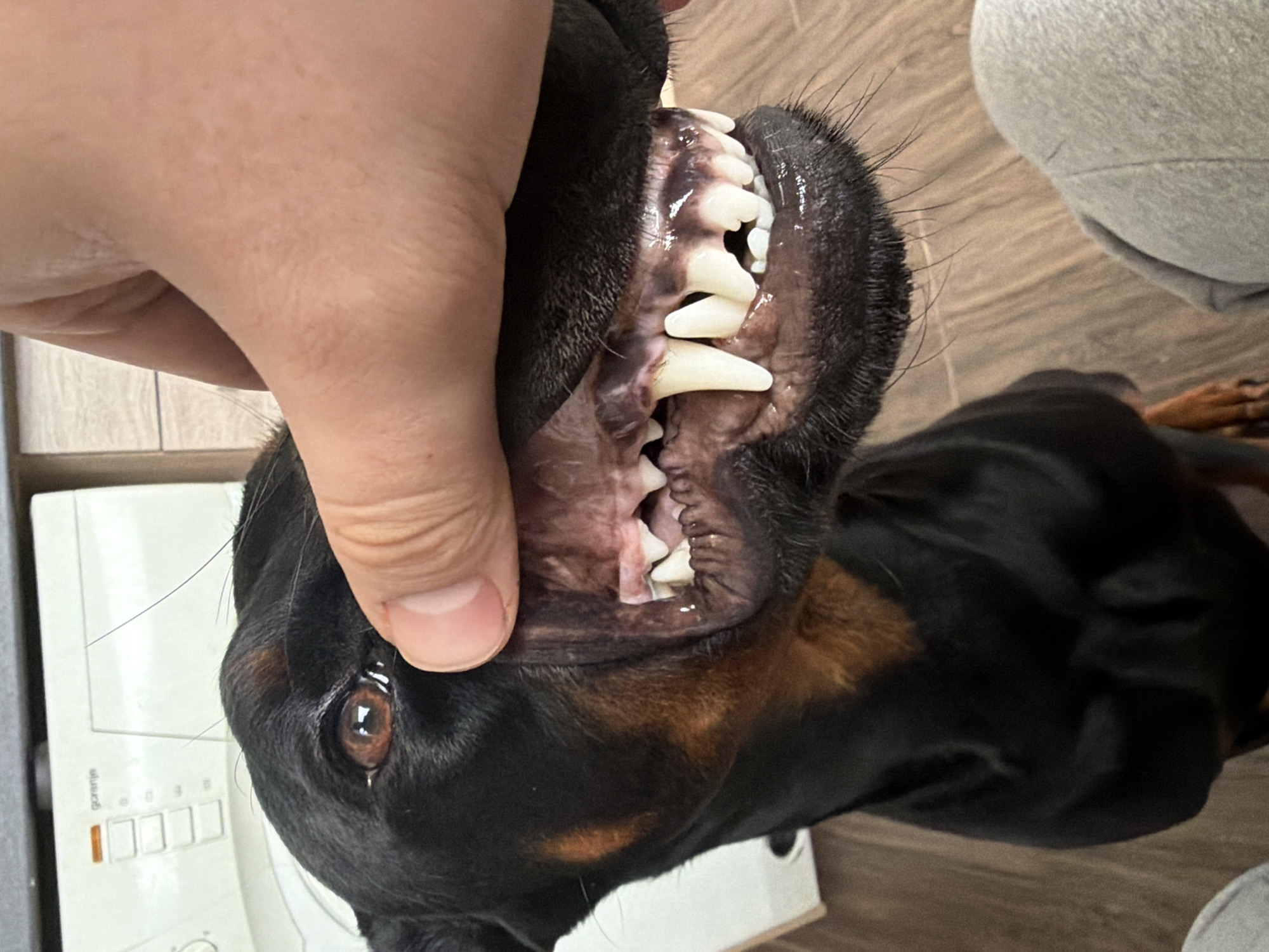 A close-up photograph depicts a black and tan Doberman Pinscher dog with its mouth held open by a human hand