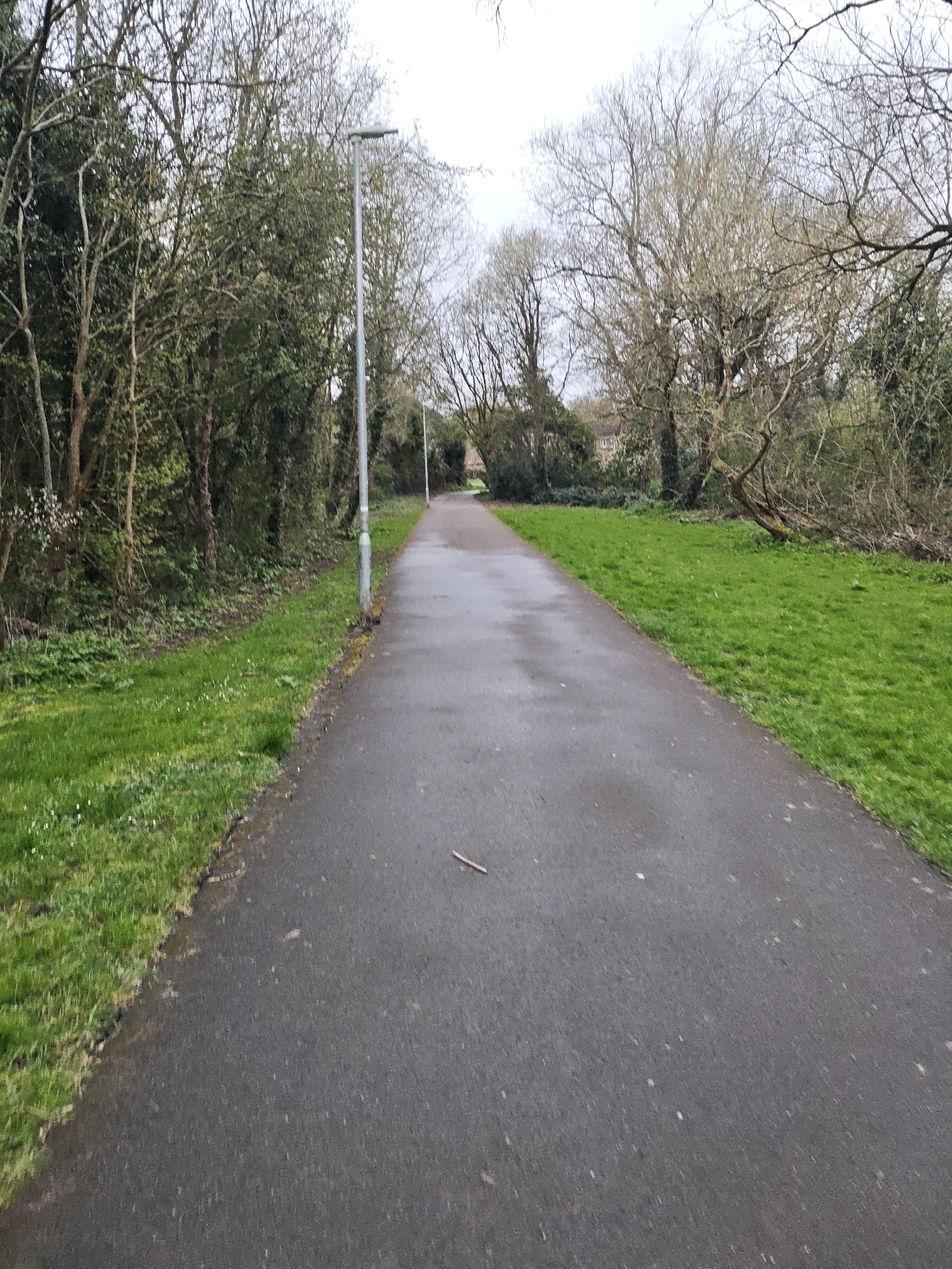 The scene depicts a straight, dark grey asphalt pedestrian pathway in Swindon, United Kingdom, appearing damp under an overcast sky. The path extends into the distance, slightly curving to the right beyond the immediate view. On the left, a narrow strip of bright green grass, dotted with small white flowers, separates the path from a dense line of trees and bushes, comprising both evergreen and deciduous species. A tall, slender grey metal lamppost with a single horizontal light fixture stands upright on the left side, beside the grass. To the right of the pathway, a wider expanse of vivid green grass is visible, beyond which numerous bare-branched deciduous trees rise. Faint architectural outlines, consistent with residential buildings, are discernible through the bare branches in the distant background. A small, thin brown stick rests on the paved surface in the foreground. No individuals or active subjects are present within the frame.