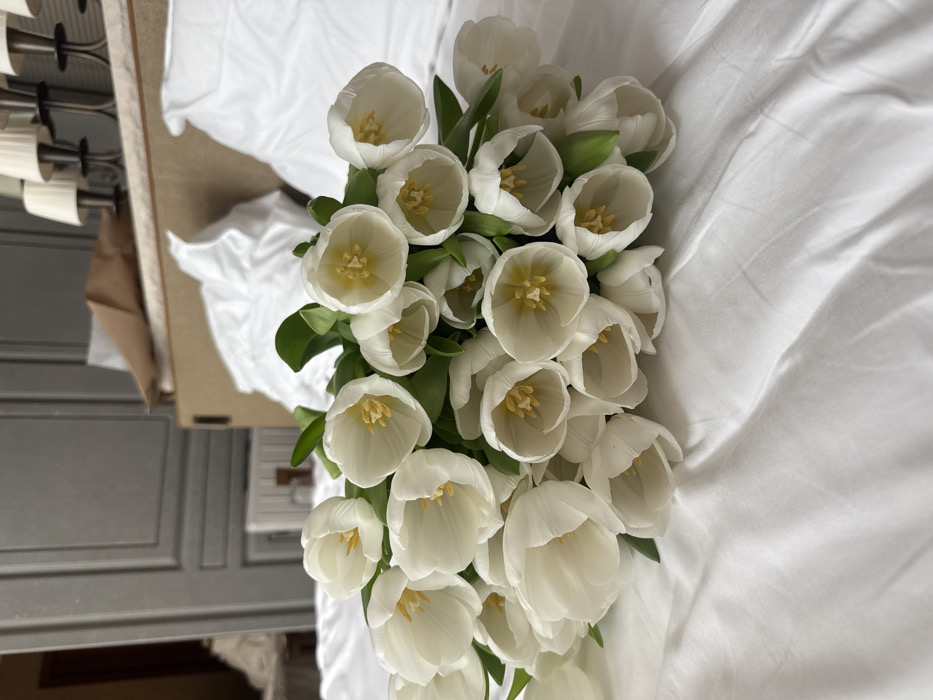 A large bouquet of fresh, white tulips is displayed on a white, wrinkled bedsheet in a bedroom located in Bordeaux, France