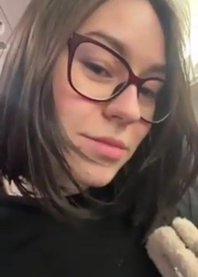 A woman with shoulder-length brown hair and wearing red-framed glasses is shown from the chest up. She wears a black top, and a light-colored glove or mitten is partially visible in the lower right corner. She looks down and to the left. The background suggests she is seated on an airplane.