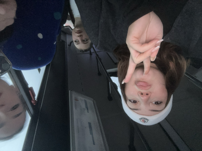 Three people are visible in the image, which is oriented upside down. One person on the right wears a white beanie and holds up two fingers in a peace sign. Another person appears in the middle with a neutral expression. The person on the left holds up a phone with a dark-colored case, obscured by a blue, polka-dotted item of clothing. A metallic surface is visible in the background, as well as some signage.