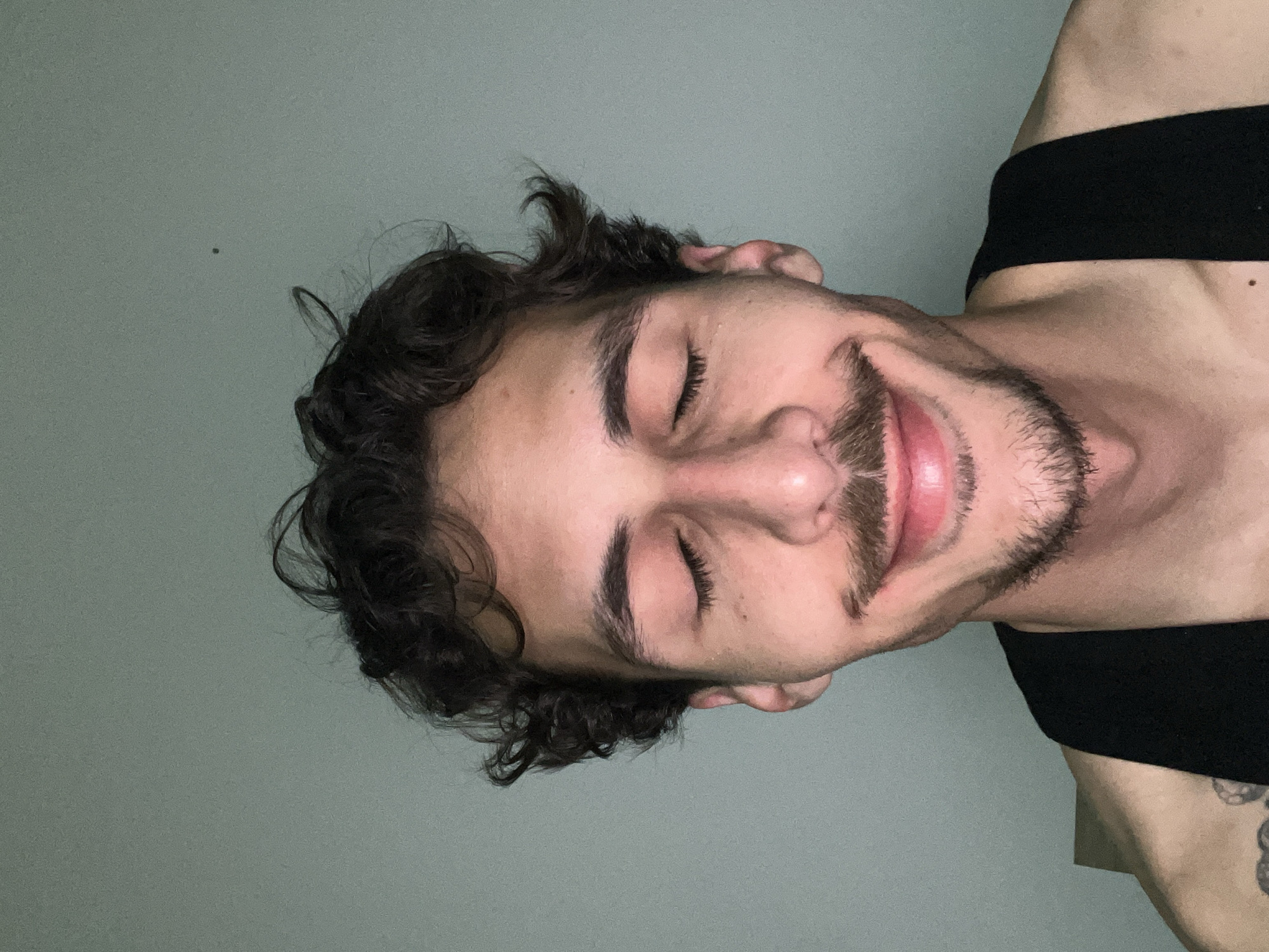 - "A close-up, low-angle shot depicts a man with curly brown hair, closed eyes, and a mustache and stubble beard, smiling slightly" by FM-T5Wdg1, licensed under CC BY 4.0