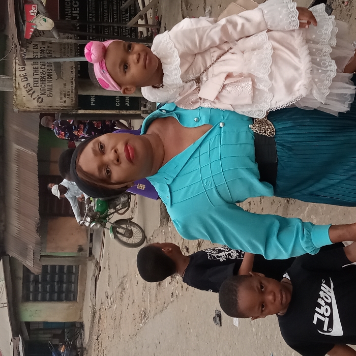 A woman in a turquoise shirt and a dark pleated skirt carries a young girl wearing a pink dress with lace trim. The girl has a pink headband with a bow. Two boys wearing black T-shirts stand below. A motorcycle is parked nearby. A building with peeling paint and a sign that reads "YES DE G" is in the background. The sign advertises kitchen and catering services. The image is rotated, placing the street scene on its side.