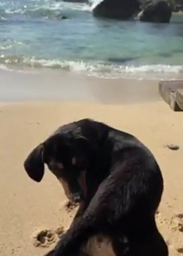 small, short-haired black dog sitting on a sandy beach and looking left towards the ocean. The dog has some tan fur on its face and legs. The camera is close to the dog and slightly above it. Behind the dog is the ocean with waves and some rocky islands close to the shore. A Sri Lankan flag is visible atop one of the islands. The sky is blue and clear. A section of a wooden structure is visible on the right side of the frame, indicating the dog may be near a deck or other construction. The beach is sandy and shows paw prints. The overall lighting suggests a bright, sunny day.