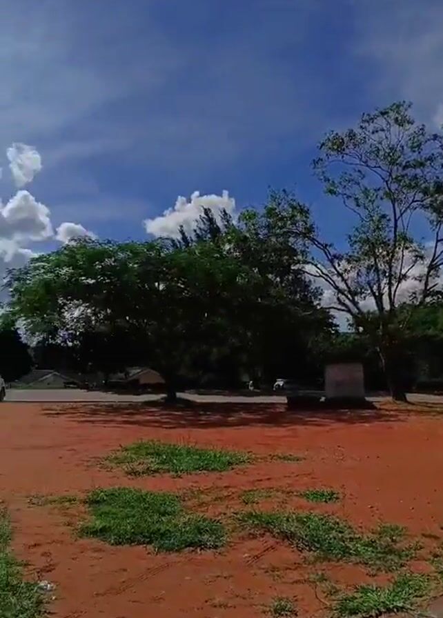 sunny day in an outdoor area. The sky is blue with puffy white clouds, and the sun is shining brightly. There are trees surrounding a red dirt area. A brick pathway leads into the red dirt area. There are buildings visible in the background. Two cars are parked near the trees. The camera pans slowly across the scene, showing different angles of the landscape.