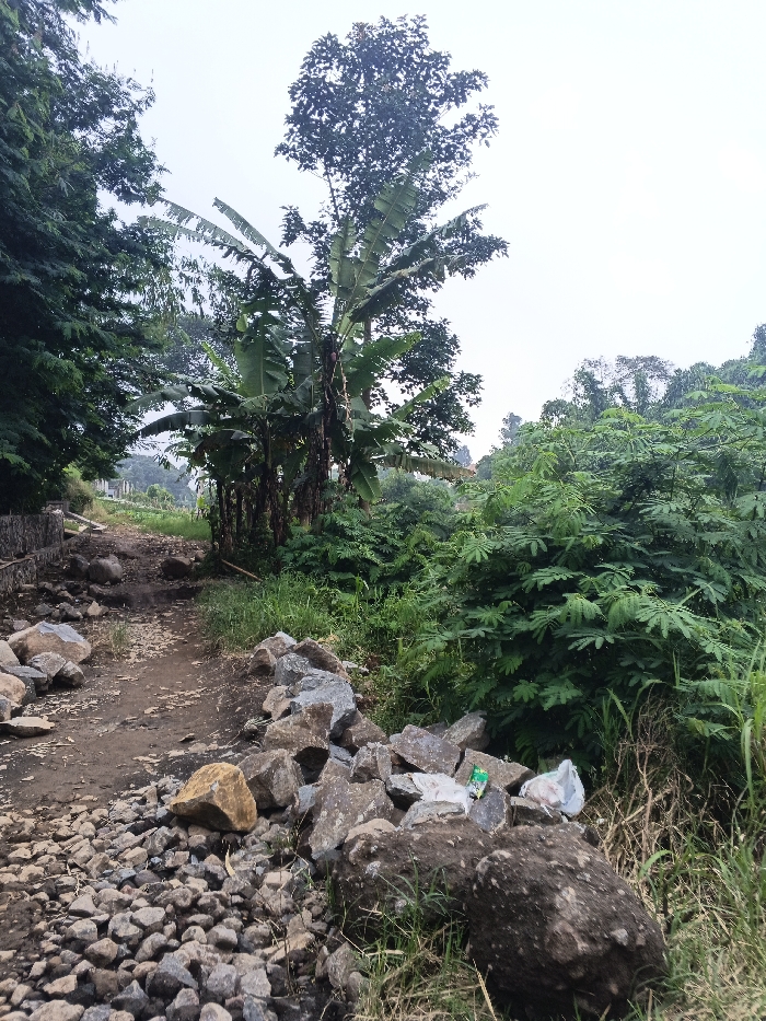 This image depicts a rural, unpaved dirt path in Makilala, Philippines, under an overcast sky. The path traverses from the foreground towards the background, showing an uneven, rocky surface. On the left, a rough, low stone retaining wall or embankment is partially visible, with numerous loose rocks and small stones scattered along the path's edge. On the right, a substantial pile of various-sized rocks borders the path; several pieces of white plastic debris, including one with a green label, are visible on top of this rock pile. Dense green vegetation surrounds the path. To the left, tall trees with dark green leaves are prominent. In the center, a cluster of several banana trees (Musa spp.) with large, tattered leaves stands, one appearing to bear a developing bunch of fruit. To the right, a thick growth of shrubs with smaller, lighter green leaves and tall grasses lines the path. No human subjects, animals, or discernible actions are present in the scene.