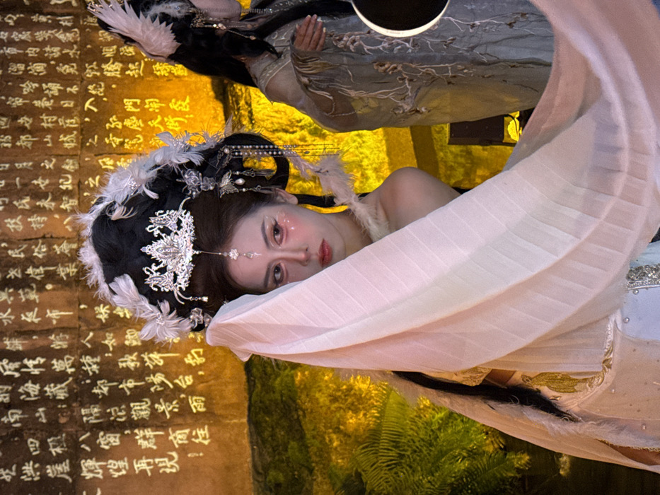 A woman in elaborate, traditional Chinese attire with ornate headdress and face makeup, is featured prominently. She is partially covered by a flowing white cloth. In the background, there's another figure in similar attire, though less visible. The scene appears to be lit artificially, with illuminated stone tablets bearing Chinese characters on the left. These elements create an atmosphere reminiscent of a historical or fantasy setting.