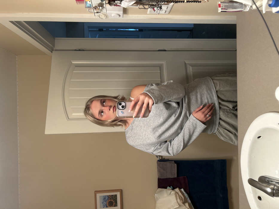 A young adult female is depicted in a mirror selfie taken within a bathroom in Whistler, Canada