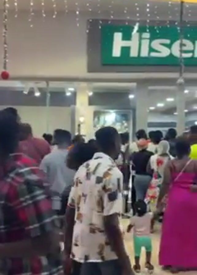 large crowd of people gathered in front of a Hisense store inside a shopping mall. The crowd appears dense, with people standing close together. There are both men and women of varying ages present. Some individuals are wearing casual clothing, while others have more elaborate attire. The environment is well-lit, with decorative string lights overhead. The Hisense store is prominently visible with its green logo. The video captures the scene from within the crowd.