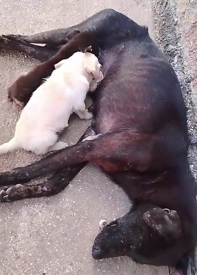 A black dog lies on a concrete surface. Two small puppies, one white and one brown, nurse from the dog. A motorcycle is partially visible in the top left corner of the frame.