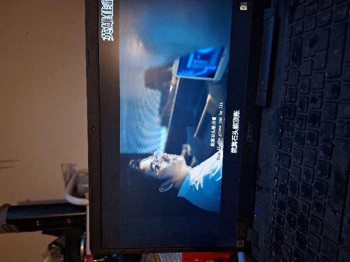 A black Acer laptop with "1080 FHD" branding is depicted indoors, displaying video content. The laptop's keyboard and surrounding chassis are visibly covered in a layer of dust. A dark, slender, rectangular object rests on the keyboard to the right of the touchpad area. The screen shows a scene featuring a male individual with dark hair and glasses, wearing a light-colored collared shirt, looking towards the right side of the frame. Chinese subtitles are present, with an English translation reading "Even if the stone can be lit". Additional Chinese text is visible above and below this line, and in the upper right corner of the screen. The background of the video shows indistinct elements, including a luminous blue screen to the right of the male figure. Above the laptop, a plain light-colored wall is visible, with a dark, vertical rectangular object and other indeterminate items partially visible to the upper left. This scene is located in Überlingen, Germany.