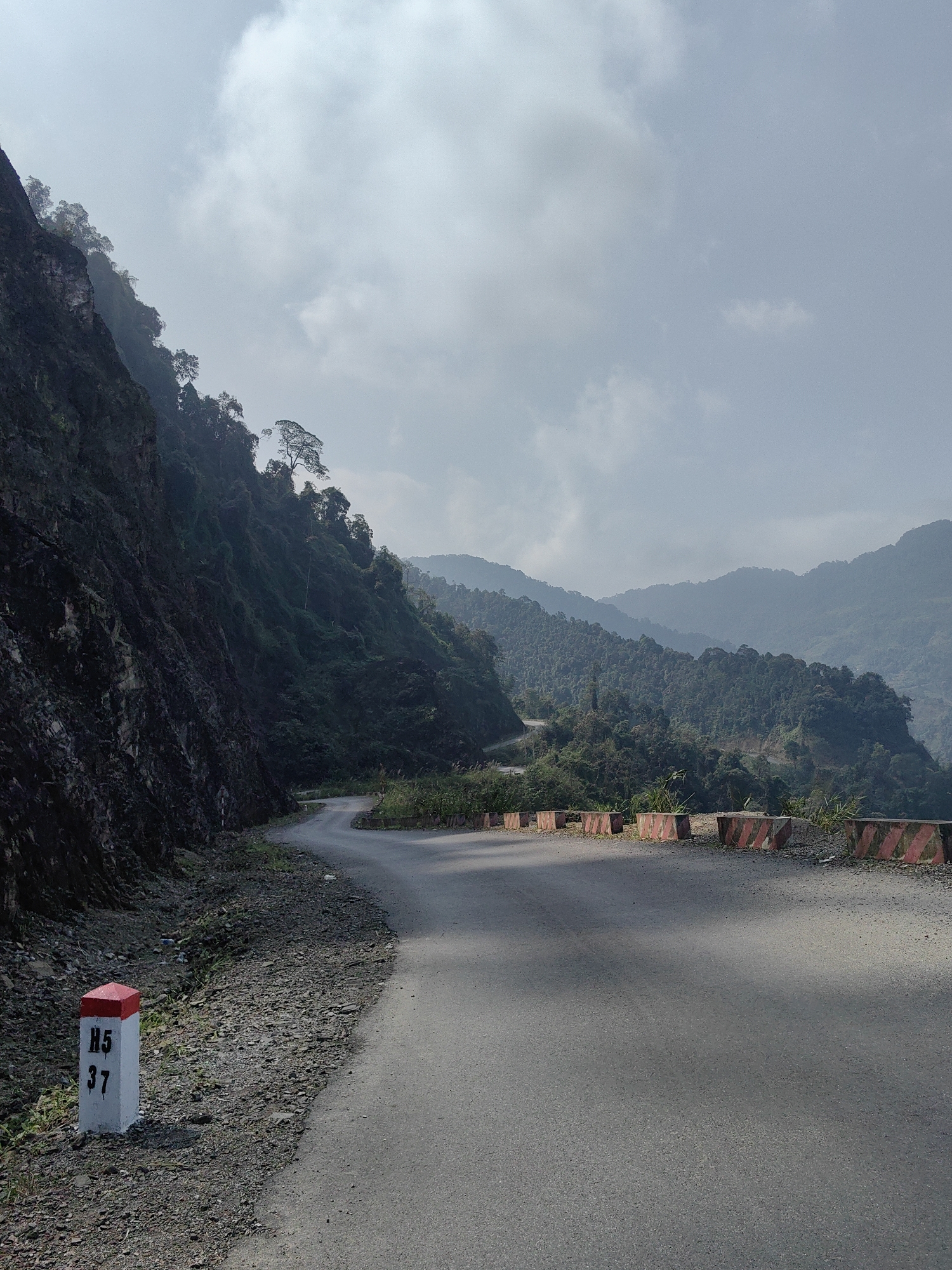 The image captures a winding road in Thuận Hòa Commune, Vietnam. The road is paved and curves sharply, bordered by a steep, rocky hillside covered in vegetation on one side and a series of concrete barriers painted with red and white stripes on the other. A small, white milestone marker with a red top stands near the roadside, displaying the black letters "H5" over the number "37". In the distance, layers of forested mountains fade into a hazy sky. The overall lighting is soft, suggesting an overcast day.