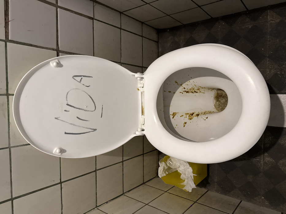 A dirty white toilet sits in a tiled bathroom. The lid is open and has the word "VIDA" scrawled on it. The toilet bowl is stained with brown residue. A crumpled yellow wastebasket with tissues is visible on the floor near the toilet. The bathroom floor is tiled with light-colored squares on one side and dark, patterned tiles on the other.