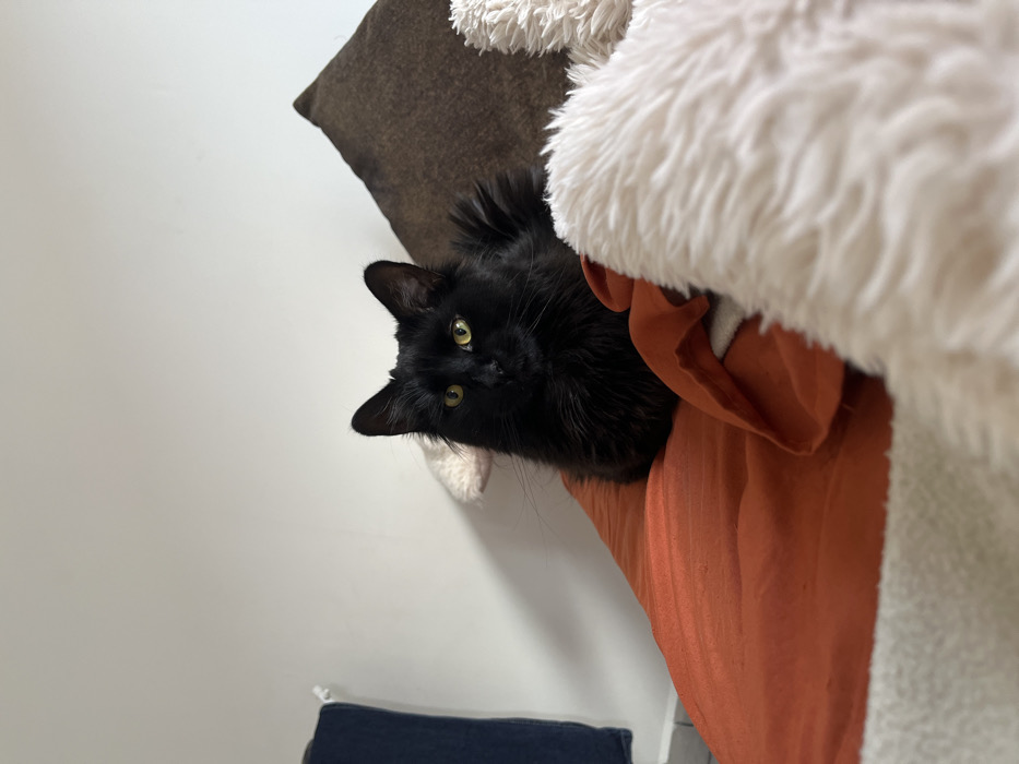 - "A black cat with long fur and yellow-green eyes is depicted sitting on an orange fabric surface, likely a bed, in a room located in Ushuaia, Argentina" by FM-Ucqa63, licensed under CC BY 4.0