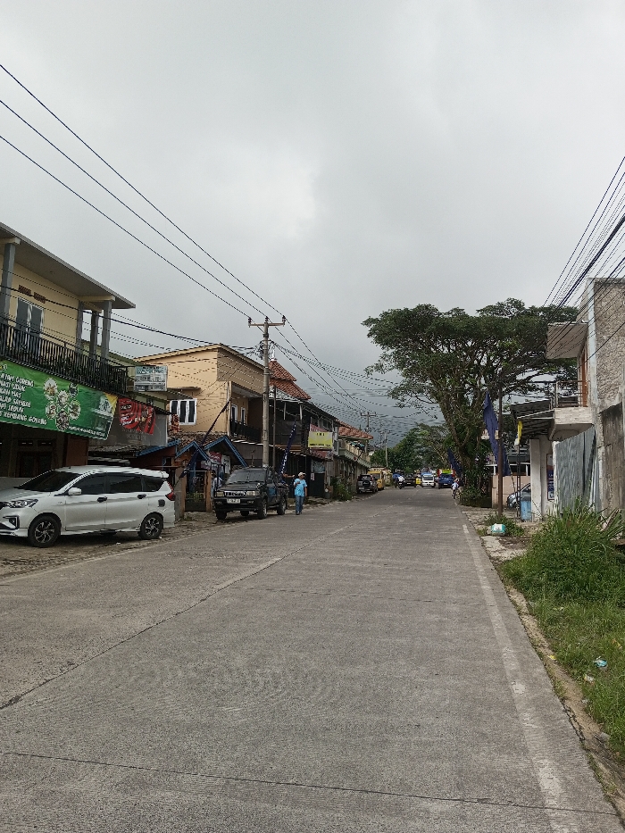 A straight, concrete road stretches through a small town under a cloudy sky. Buildings line both sides, varying in height and architecture, with overhead electrical wires crisscrossing the view. A white car is parked on the left side of the road, and a black SUV is further down the street. A person walks along the road near the SUV. In the distance, a large tree dominates the view, obscuring parts of a mountain range. The road appears relatively quiet, with only a few vehicles visible further ahead. Vegetation grows along the right side of the road.
