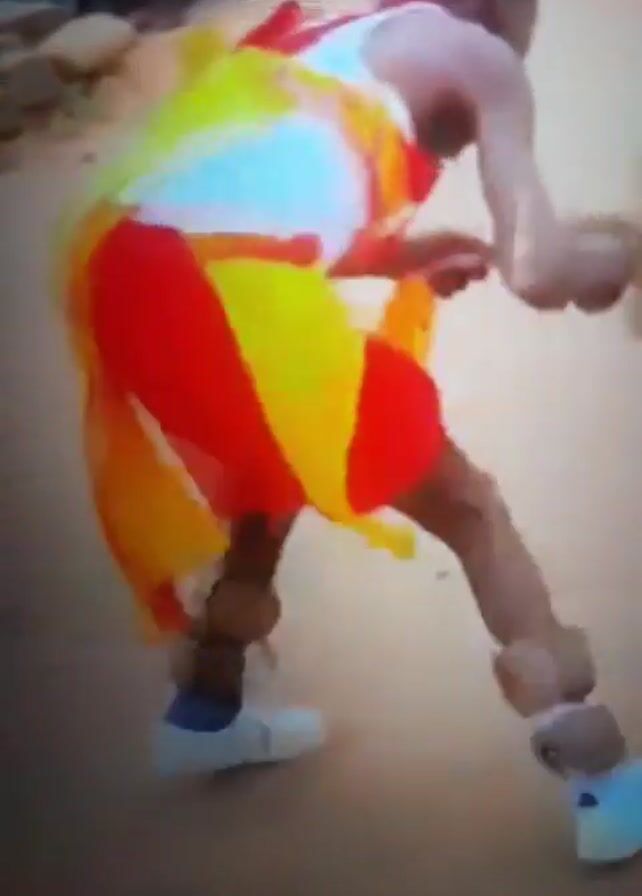 A young, shirtless person wearing a red and yellow patterned skirt, white sneakers with blue socks, and what appears to be rattles attached to their ankles is dancing in an outdoor setting. They are holding an object in their right hand, possibly a ritual instrument. Behind them, a blurred crowd of people observes. The ground appears to be dirt or sand. The video is somewhat grainy and the lighting is bright.