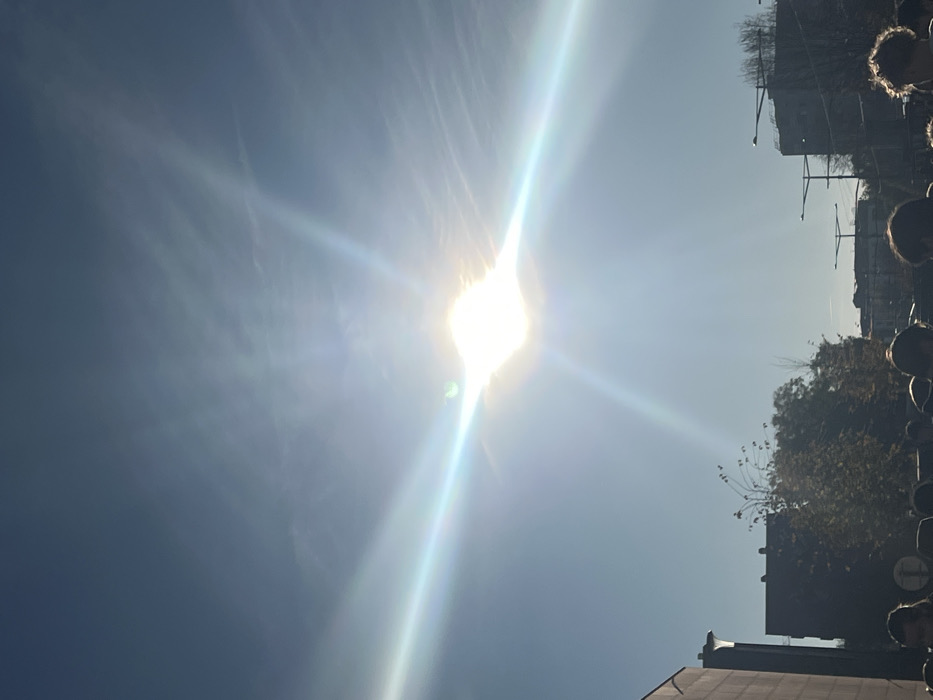The scene depicts an outdoor urban environment in Schiltigheim, France, under a clear, bright blue sky with faint cirrus clouds. The sun is positioned centrally in the upper half of the image, appearing as an intense white light source with prominent lens flare emanating in multiple directions, creating a distinct cross pattern and horizontal light streaks across the frame. In the lower portion of the image, the heads and upper torsos of a group of approximately ten individuals are visible, indicating a gathering or crowd. Their faces are largely obscured or in silhouette due to the strong backlighting from the sun. Visible hair textures vary, with some appearing curly and others straighter. To the left, a dark, angular building structure is partially visible, featuring a sharp corner and a vertical lighting fixture extending upwards. In the midground, silhouetted against the bright sky, are several deciduous trees, some displaying residual autumn foliage and others appearing largely bare. Behind these trees and extending towards the right, the dark silhouettes of multiple urban buildings are present, along with several streetlights characterized by horizontal arms. The overall impression is a sunny day in a populated area.