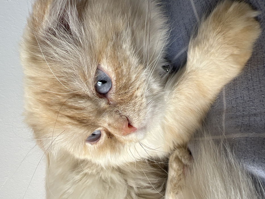 - "A cream-colored cat with striking blue eyes gazes upwards" by FM-RkAm93, licensed under CC BY 4.0
