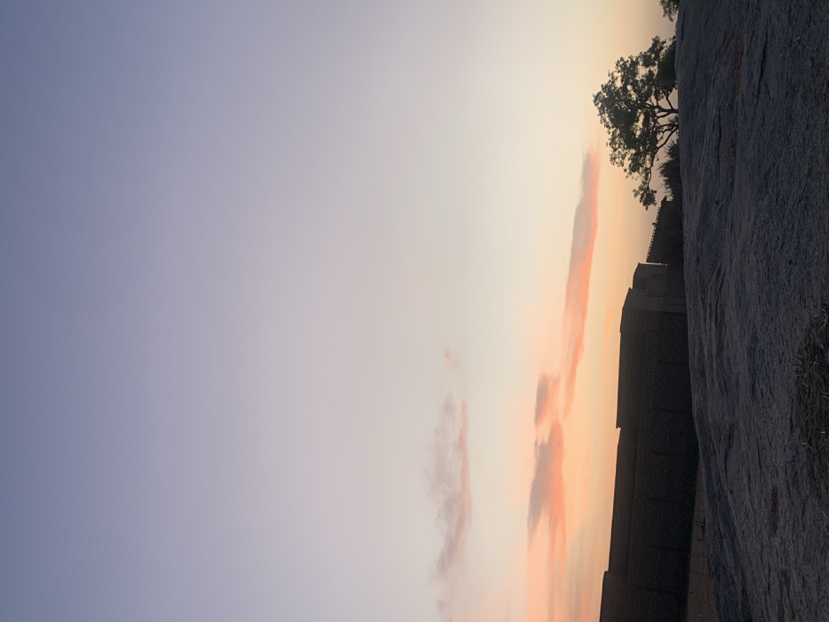 A vertical shot displays a clear sky blending from pale blue to a vibrant sunset hue. Wisps of reddish-pink clouds stretch across the horizon. Adjacent to the sky, a dark, rugged rocky terrain is seen. At the edge, there's a silhouette of a tree. A stone wall structure aligns with the rock formation, creating a stark contrast. The setting evokes a serene, natural landscape under a colorful sky.