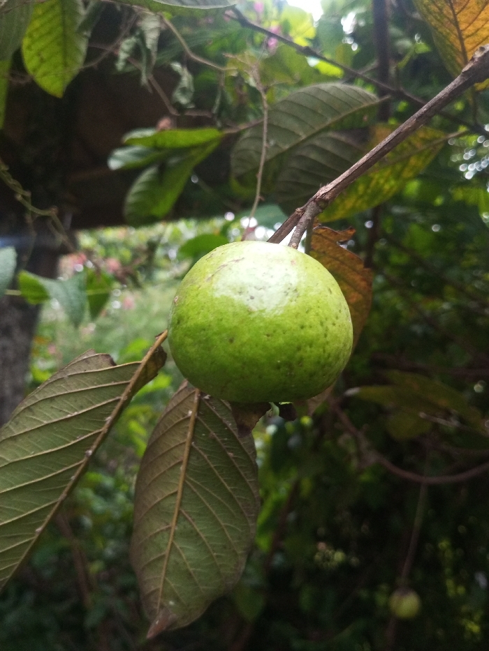 - "A close-up photograph depicts a single, spherical, unripe green guava fruit suspended from a slender brown branch, positioned in the approximate center of the frame" by FM-U3GeU2, licensed under CC BY 4.0